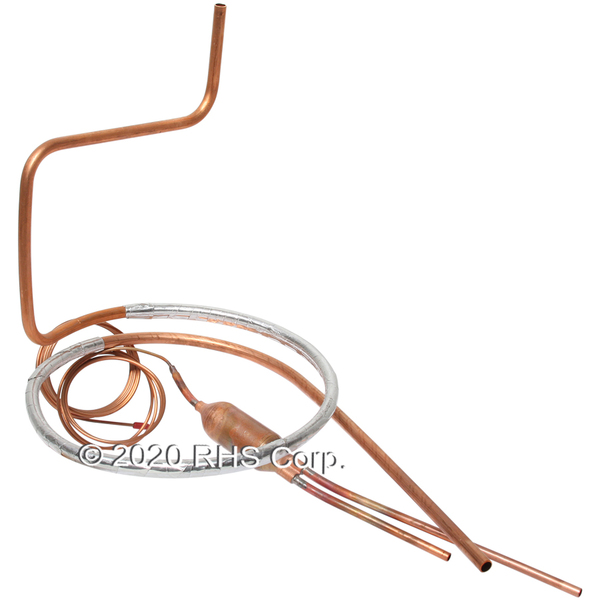 MAIN LINE IS A 3/8 OD COPPER TUBE THAT IS STRAIGHT FOR ABOUT 7" THEN IS COILED ABOUT 1-1/2 TURNS, THEN GOES UP AROUND 7", THEN ACROSS AROUND 7", AND BACK UP 4". THE 3/8" LINE AND A LENGTH OF THE CAPILARY TUBING IS WRAPPED IN FOIL TAPE . THE CAP TUBING IS .054 ID ONE END IS COILED W/NOTHING ATTCHED. THE OTHER END GOES TO A FILTER/DRYER THAT HAS TWO LINES OF 1/4" OD COPPER TUBE COMING OUT 1 END. 1 LINE IS 5-1/4" OTHER 8-1/4".