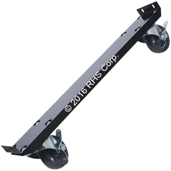 OVERALL LENGTH OF BRACKET IS 27" LONG, AND 4-1/2" WIDE. SCREW HOLE CENTER LINES, 25-1/4" AT FURTHEST AND 17-1/4" AT CLOSEST. CASTOR IS 4" TALL, 5" OVERALL W/ BRACKET. BRACKETS ARE BLACK FINISH.